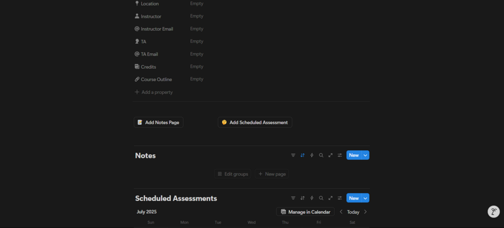 A Full Notion Template including: Course Pages installed with a section to add Notes as well as schedule assessments with buttons, Master Calendar View, Pomodoro widget, and a Spotify Playlist!