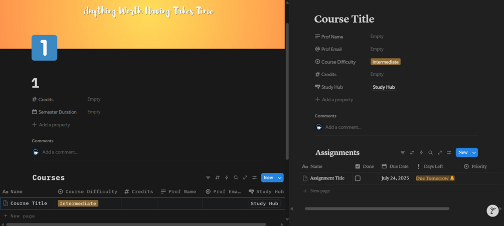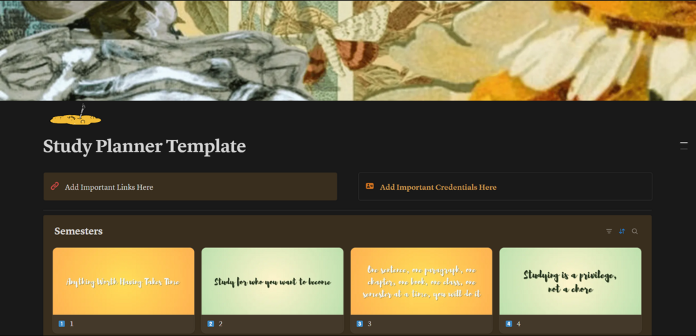 This is a combo of the Study/Uni Planner with the Study Hub for easier access to both pages through a button on the main page of the Study Planner as well as each course that you add each Semester, that too for a cheaper price! I've used this template for my A-Levels as well as continue to use it in uni so I hope it helps you as much as it did for me. Make sure to go through each of them listed on my profile for an in depth view of both!